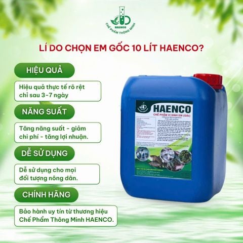 Chế phẩm EM gốc HAENCO là dạng chế phẩm vi sinh đậm đặc, chứa hệ vi sinh vật hữu hiệu Effective Microorganisms gồm nhóm Lactobacillus, nấm men, xạ khuẩn, vi khuẩn quang hợp (PPB)…gồm: Streptomyces; Rhizobium:; Lactic; Bacillus; Vi khuẩn quang hợp; Nấm men và xạ khuẩn; pH = 3.5÷4.0 . Đây là nền tảng quan trọng để sản xuất các dòng EM ứng dụng như EM2, EM tạt ao, EM phun lá, EM xử lý chuồng trại, EM đệm lót sinh học và EM dùng cho chăn nuôi – thủy sản.vv...