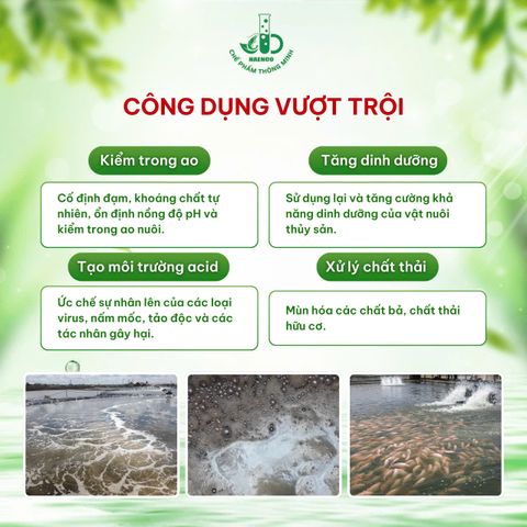 + Khống chế các vi khuẩn gây hại hiện diện trong ao nuôi, cung cấp hệ vi sinh vật có lợi, ổn định hệ sinh thái ao nuôi