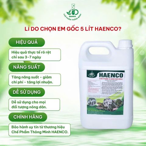 Chế phẩm EM gốc HAENCO là dạng chế phẩm vi sinh đậm đặc, chứa hệ vi sinh vật hữu hiệu Effective Microorganisms gồm nhóm Lactobacillus, nấm men, xạ khuẩn, vi khuẩn quang hợp (PPB)…gồm: Streptomyces; Rhizobium:; Lactic; Bacillus; Vi khuẩn quang hợp; Nấm men và xạ khuẩn; pH = 3.5÷4.0 . Đây là nền tảng quan trọng để sản xuất các dòng EM ứng dụng như EM2, EM tạt ao, EM phun lá, EM xử lý chuồng trại, EM đệm lót sinh học và EM dùng cho chăn nuôi – thủy sản.vv...